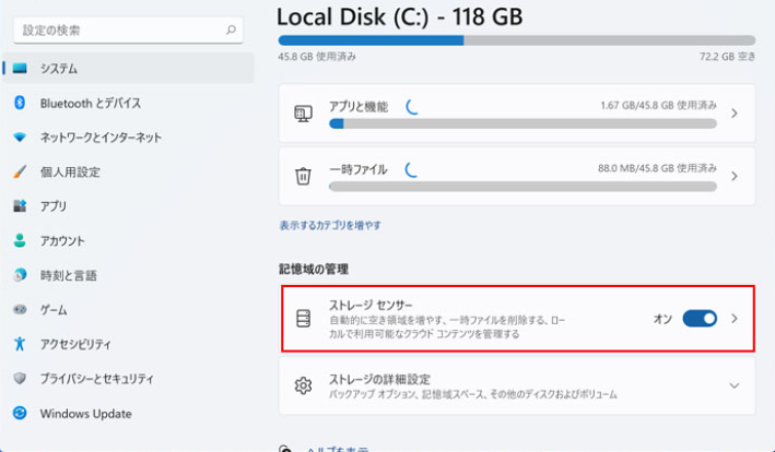 パソコンのストレージ容量が不足していると、システムのパフォーマンスが低下し、起動速度が低下することがあります。ストレージセンスーというWindows標準機能を使用して、不要なジャンクファイルを自動的に削除することで、空き容量を確保でき、動作速度を向上させることができます。