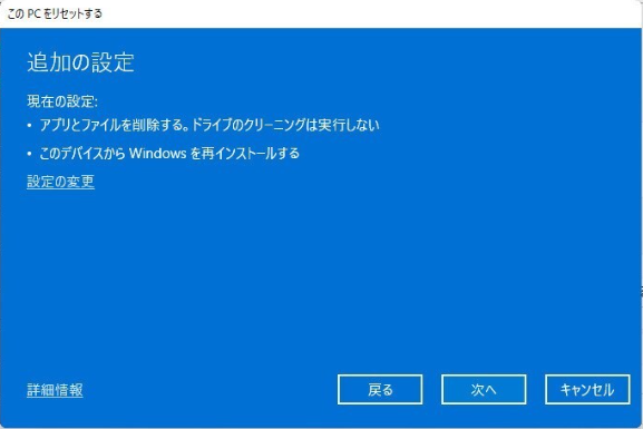 4. 設定を確認し、変更したい場合、「設定の変更」をクリックします。問題がなければ、「次へ」→「リセット」をクリックして、PCのリセットを始めます。
