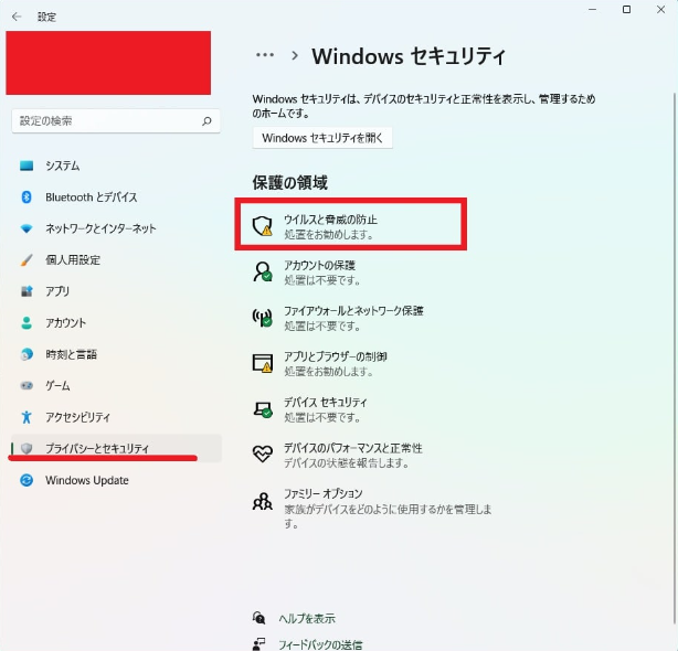 1. 「Windows」+「I」キーを押して「設定」を開きます。「プライバシーとセキュリティ」→「ウイルスと脅威の防止」を選択します。