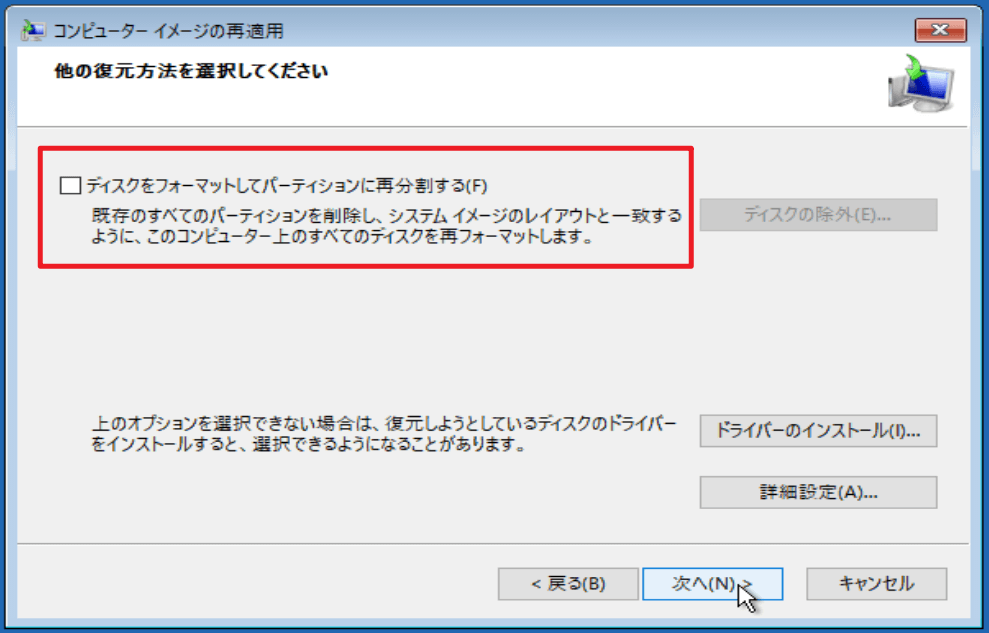 手順 3. 「このシステムバックアップを復元」にチェックを入れます。その後、「次へ」をクリックします。*システムを他のドライブやハードディスクに復元したい場合、「システムを他の場所に復元」をチェックして、復元先を指定します。
