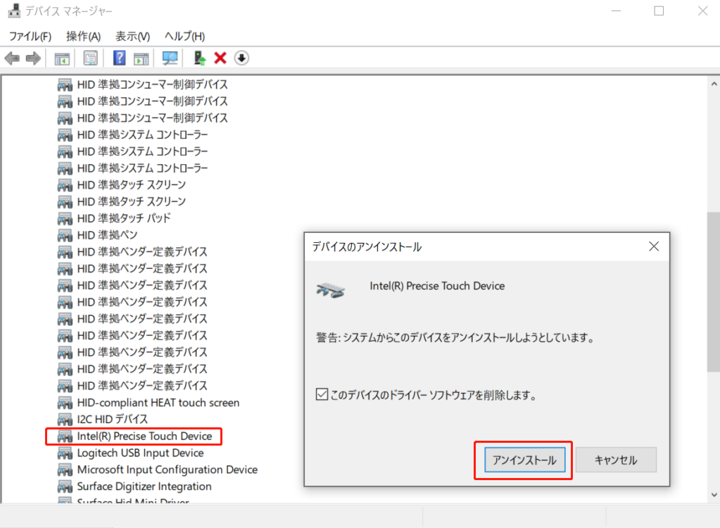 2. 「ヒューマンインターフェースデバイス」をダブルクリックして、展開します。「Intel(R) Precise Touch Device」を見つけて右クリックし、メニューから「デバイスのアンインストール」を選択します。