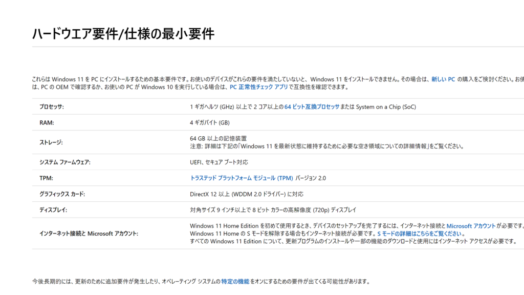 CPU:1GHz以上で2コア以上の互換性のある64ビットプロセッサーまたはシステムオンチップが必要です(Intelプラットフォームの場合は、第8世代インテルCoreプロセッサー以上が必要ですが、一部のハイエンドの第7世代インテルCore プロセッサーもサポートしています。AMDプラットフォームの場合は、Ryzen 2以上が必要です。Qualcommプラットフォームの場合、Snapdragon 7c以上が必要です)。