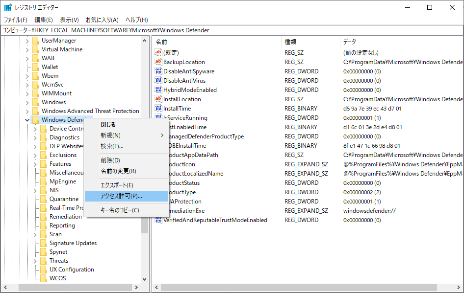 2. 「HKEY_LOCAL_MACHINE\SOFTWARE\Microsoft\Windows Defender」に移動します。
