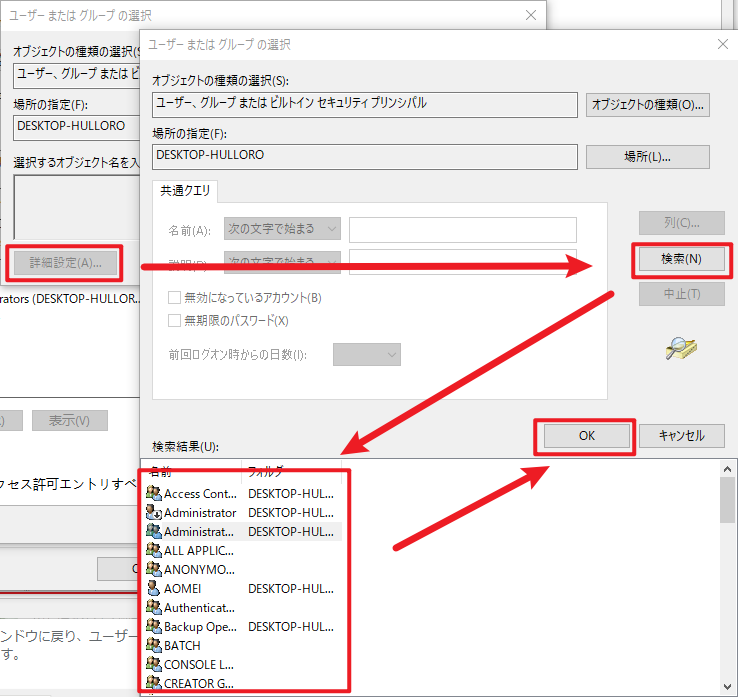 5. 「詳細設定」→「検索」をクリックします。管理者アカウントまたは管理者グループを選択し、「OK」をクリックします。次に、もう一度「OK」をクリックして変更を確認します。
