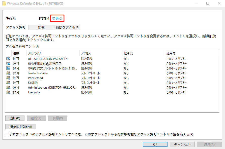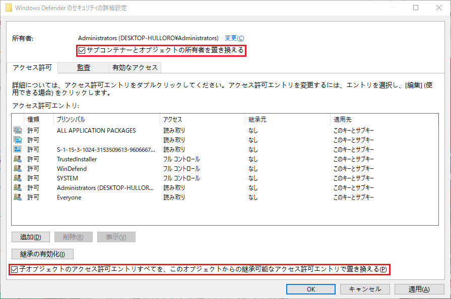 6. 「サブコンテナーとオブジェクトの所有者を置き換える」と「子オブジェクトのアクセス許可エントリすべてを、このオブジェクトからの継承可能なアクセス許可エントリで置き換える」にチェックを入れ、「OK」をクリックし、変更を保存します。
