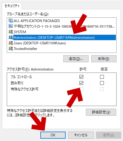 7. 「アクセス許可」ウィンドウに戻り、ユーザーに「フルコントロール」を許可し、「適用」→「OK」をクリックして確認します。