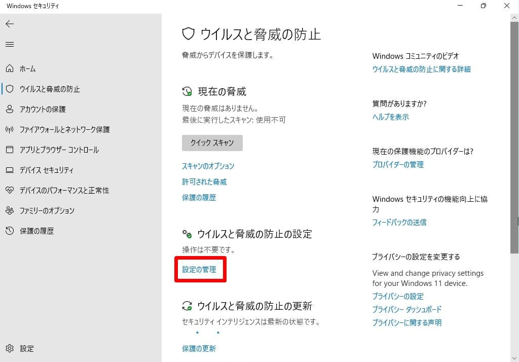 3. 「ウイルスと脅威の防止の設定」セクションで、「設定の管理」をクリックします。