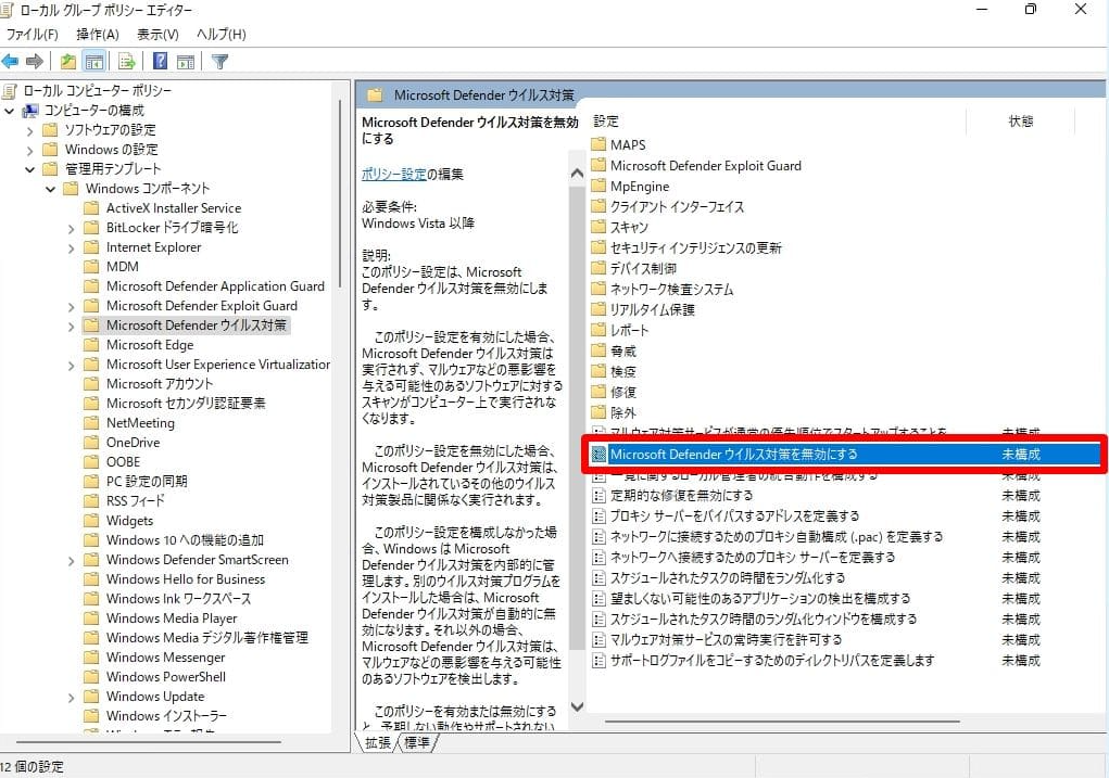 3. 「コンピューターの構成」→「管理用テンプレート」→「Windowsコンポーネント」→「Microsoft Defenderウイルス対策」に移動し、右ペインにある「Microsoft Defenderウイルス対策を無効にする」をダブルクリックします。