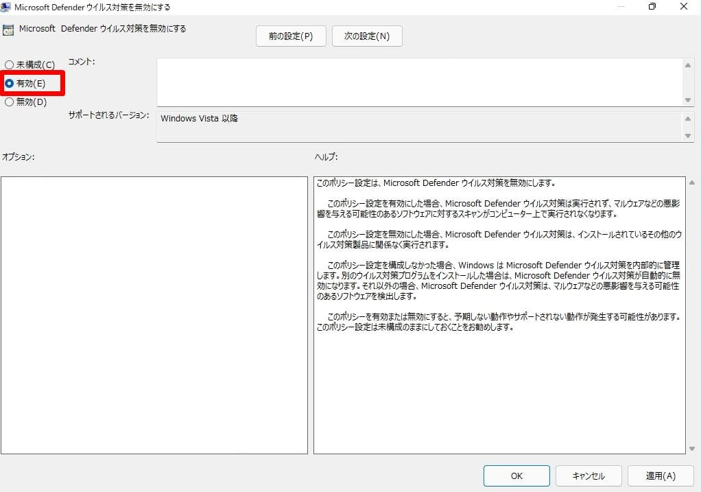 4. ポップアップウィンドウで、「有効」を選択し、「OK」をクリックして、変更を適用します。完了したら、PCを再起動します。再起動後、Windows Defenderは実行されなくなります。