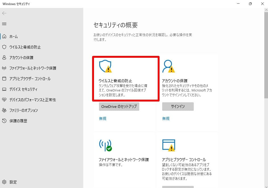 2. 「ウイルスと脅威の防止」をクリックします。