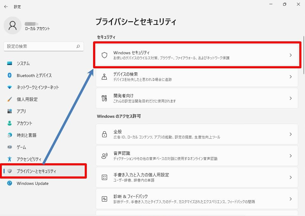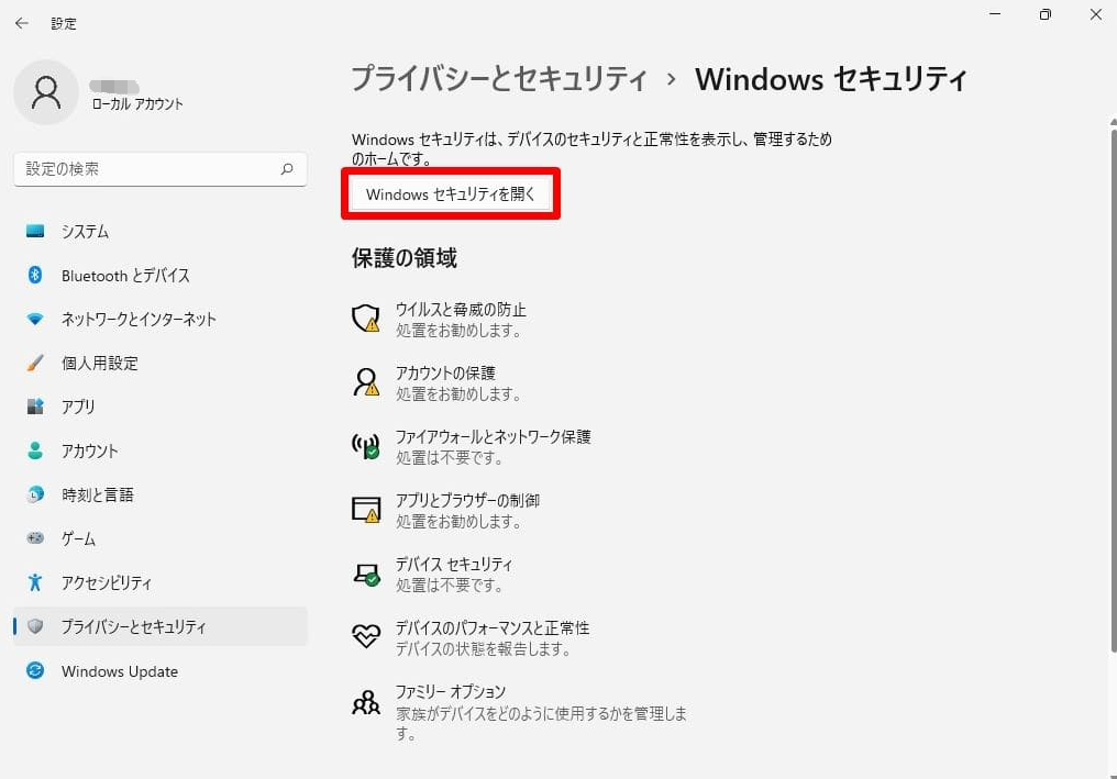 1. 「Windows」+「I」キーを押して、「設定」を開きます。「プライバシーとセキュリティ」→「Windowsセキュリティ」をクリックします。「Windowsセキュリティを開く」を選択します。