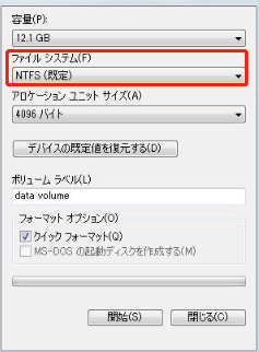 2. 次のウィンドウで、ファイルシステムをNTFSに選択します。その他のプロパティは変更しないでください。