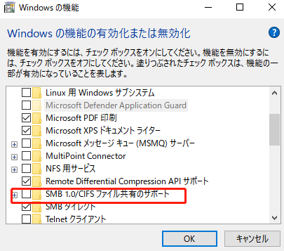 修正2:SMB 1.0/CIFSファイル共有プロトコルを有効にする