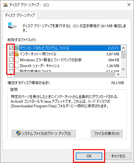 3. 「インターネット一時ファイル」「一時ファイル」など、削除したいファイルを選択し、「OK」をクリックします。