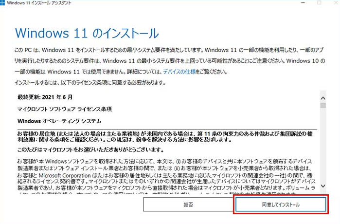 2. ライセンス条項が表示され、確認した後、「同意してインストール」をクリックしてWindows 11 23H2をインストールします。