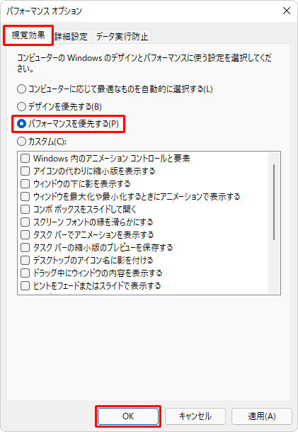 3. 「視覚効果」タブをクリックし、「パフォーマンスを優先する」を選び、「OK」→「OK」をクリックします。
