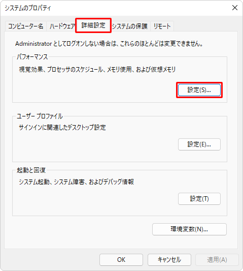 2. 「パフォーマンス」項目の「設定」をクリックします。