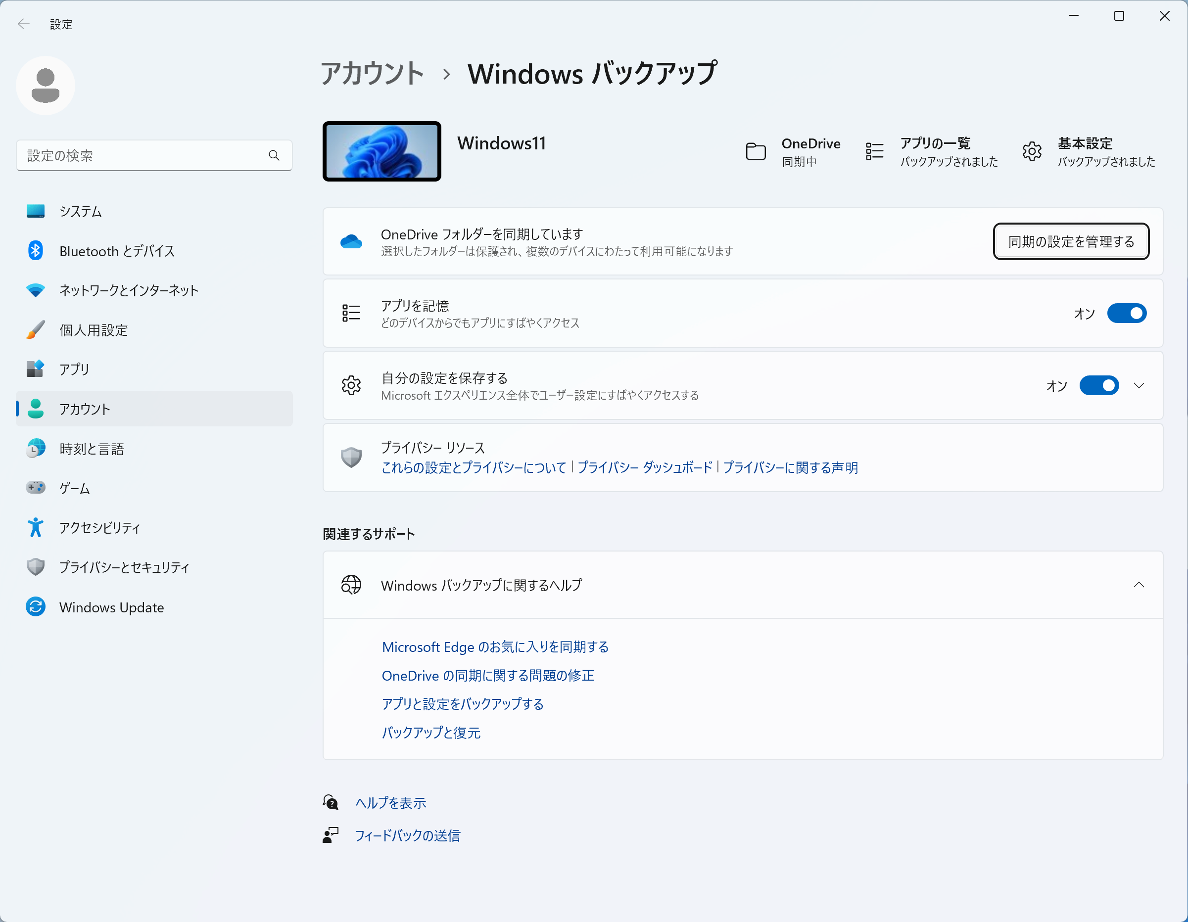1. スタートボタン→「設定」→「アカウント」→「Windows バックアップ」→「同期の設定を管理する」をクリックします。