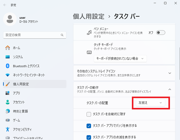 3. 「タスクバーの配置」のタブで「左揃え」を選びます。これによりタスクバーの表示はWindows 10と同じように左寄せになります。