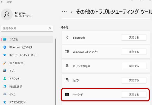 3. 「その他のトラブルシューティングツール」が開きますのて、「キーボード」をクリックします。その横にある「実行する」ボタンをクリックします。