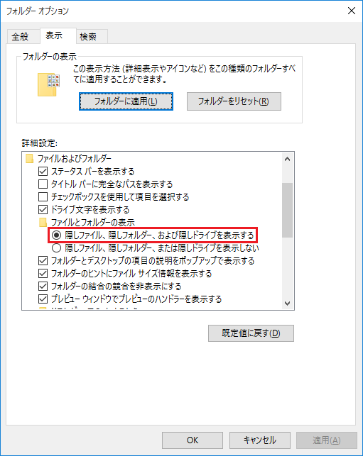 手順 2. 「表示」タブで、隠しファイルと隠しフォルダーの設定を見つけます。「隠しファイル、隠しフォルダー、および隠しドライブを表示する」オプションをオンにして、「適用」をクリックします。