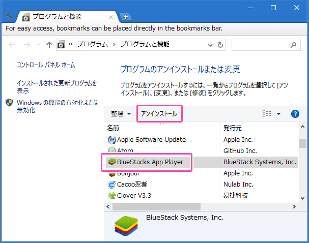 手順 1. コントロールパネルのプログラム一覧から「BlueStacks App Player」を探して「アンインストール」をクリックします。