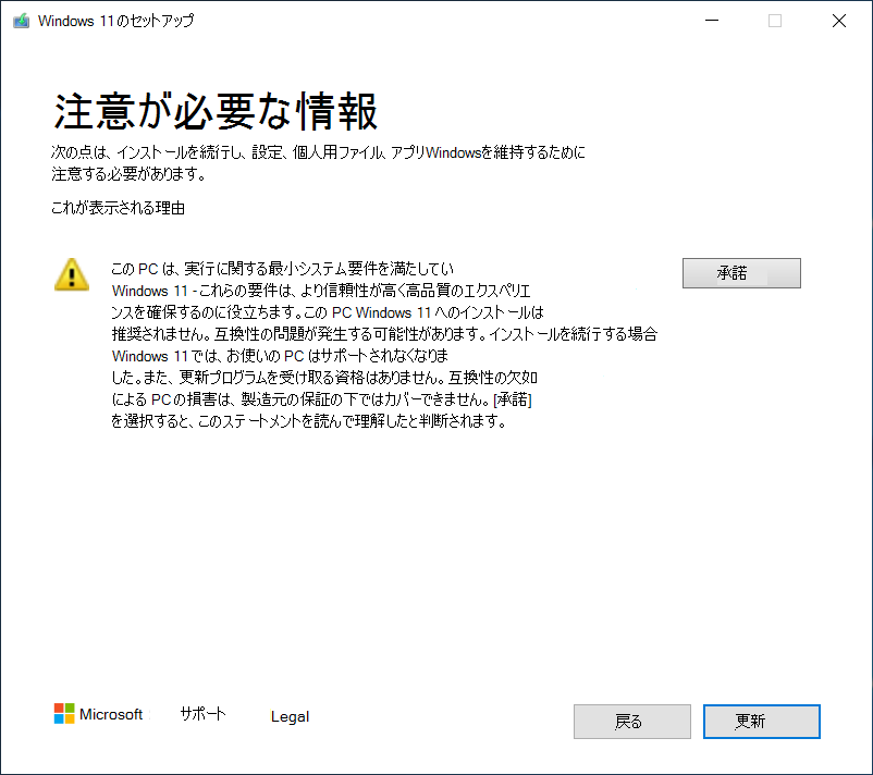 Win11のアップグレード中に、「注意が必要な情報」というエラーウィンドウが表示されました。しかし、システムは完全に標準に達しているので、この問題をどのように解決すればよいですか?