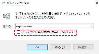 4. 新しいタスクの作成ウィンドウで、「開く」フィールドにexplorer.exeを入力し、「このタスクに管理者特権を付与して作成します。」チェックボックスをオンにします。