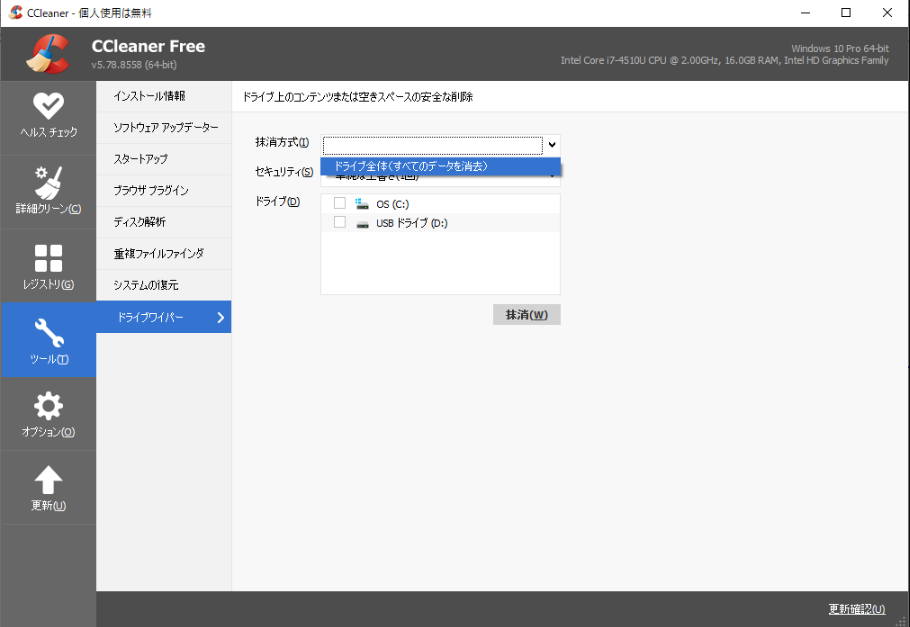 1. CCleanerをダウンロードし、インストールしたら、プログラムを開き、「ツール」⇒「ドライブワイパー」を選択します。「空きスペースのみ」または「ドライブ全体」を選択して、ドライブ上のすべてのファイルを消去します。