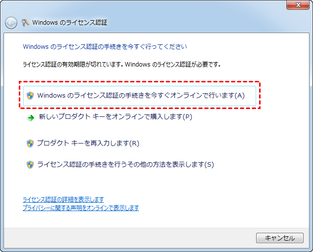 Windows7のライセンス認証が完了していない、もしくはライセンス認証を行わずに30日以上経過します。Windowsをご使用するにあたり、ライセンス認証の手続きを必ず行っていただく必要がある場合、または一度ライセンス認証を行った後でも、再び手続きが必要になる場合があります。