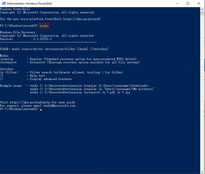 단계 2. "winfr"을 입력하고 Enter 키를 누릅니다. Windows 파일 복구 응용 프로그램이 실행됩니다. 삭제된 파일을 복구하기 위해 필요에 따라 명령을 입력할 수 있습니다.