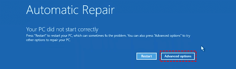 1. Start your computer and press the 0 (zero) or F12 Toshiba recovery key to open the Automatic Repair window. Choose Advanced options.