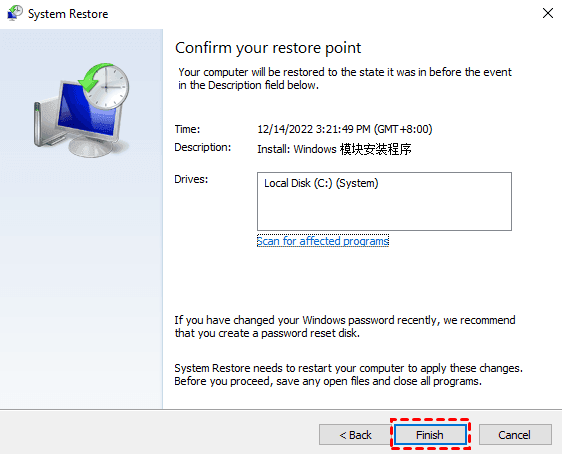 4. Confirm your restore point and click Finish to start system recovery with Toshiba restore point.