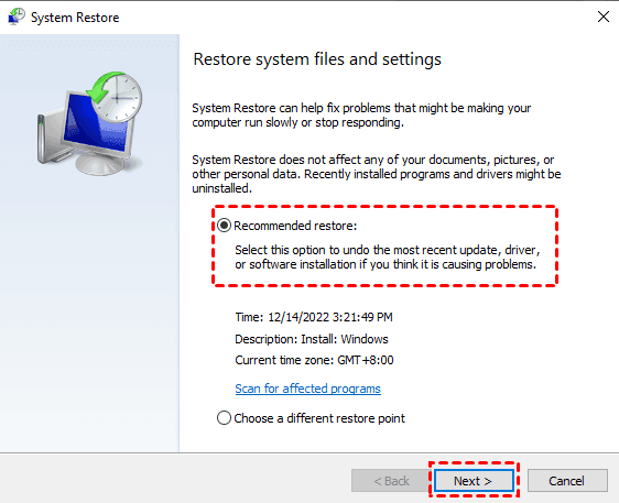 If the restore point in Recommended restore is damaged or you want to restore to a different point, tick Choose a different restore point and select the one you want in the next window.