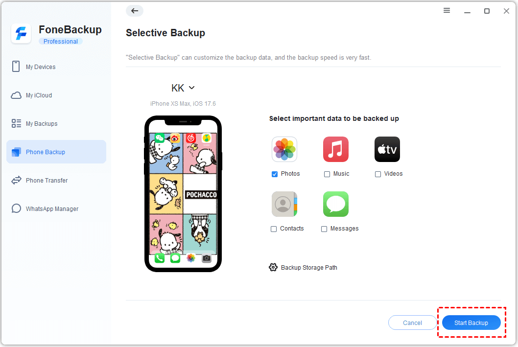 Step 1. Step 1. Connect your iPhone to computer > Click Phone Backup on its homepage > Choose Selective Backup and click Get Started.