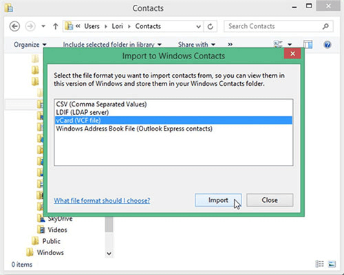 1. Navigate to the folder - C:\USers\%username%\Contacts - in Windows Explorer > Click Import on the toolbar.