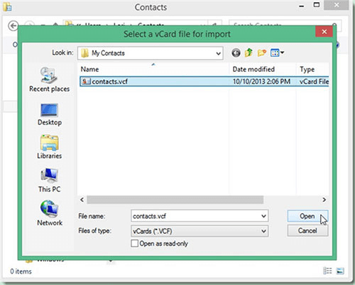 3. Find and open the folder that saves your iPhone contacts > Choose the contacts and hit Open.