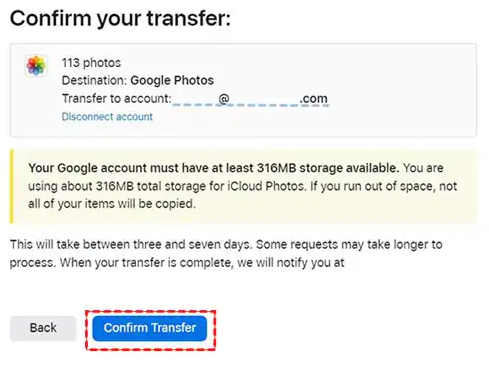 Step 5. Click Confirm Transfer to back up the selected data from iCloud Photos to Google Photos.