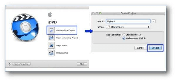 Step 2. Launch iDVD and click Create a New Project > In the pop-up interface, give a name and choose the aspect ratio as you like > Click Create to continue.