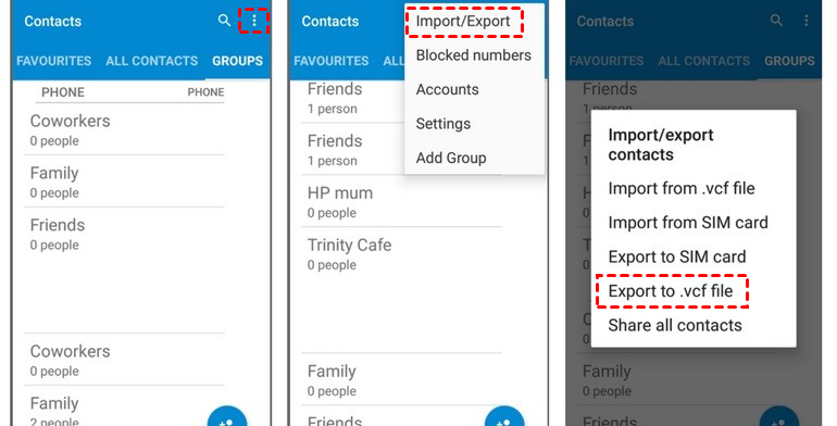 Step 1. Go to Contacts app on Samsung > Tap the three dots > Choose Import/Export contacts > Tap Export to .vcf file> Email it to your iPhone.