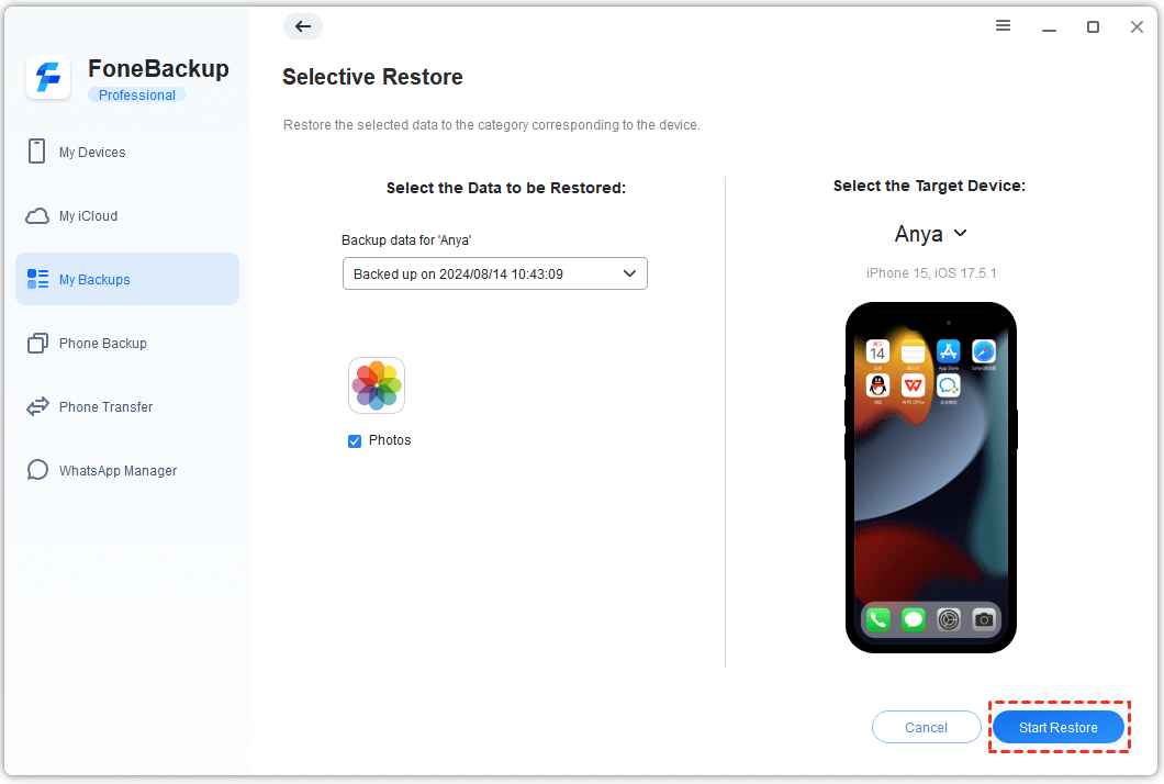 Step 5. When the backup is done, you can remove the old iPhone and plug the new one into the computer > Go to the Backup History screen and click Start Restore, and the photos will be transferred to the new iPhone.