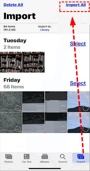 Step 2. In Photos, select Import and choose the videos you want to transfer > To import all the videos, just tap Import All.