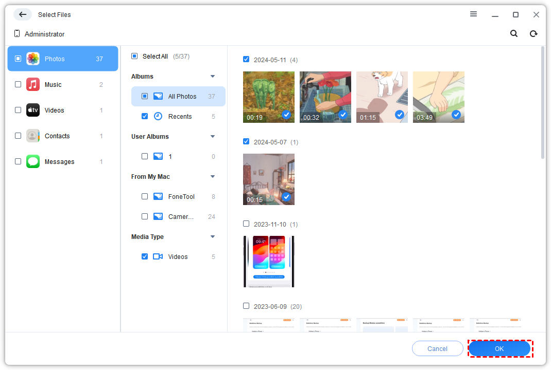 Step 2. Click the plus icon and choose Photos icon to preview photos > Select the pictures you’d like to backup > Click OK to confirm.
