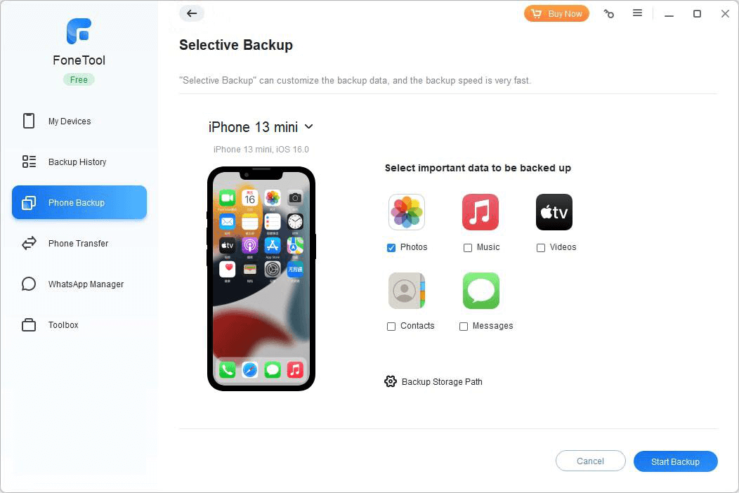 Step 1. Connect your iPhone to computer with USB > Launch FoneTool > Click Phone Backup and go to Selective Backup.