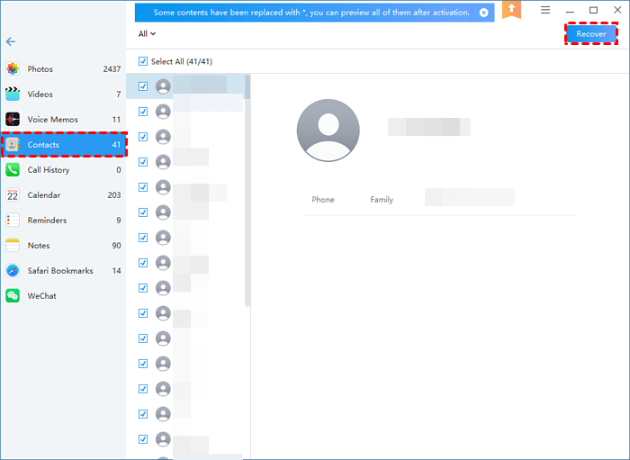 Step 2. All lost data on your iPhone will be listed, Click Contacts or any types of data you need, and click Recover to make it.