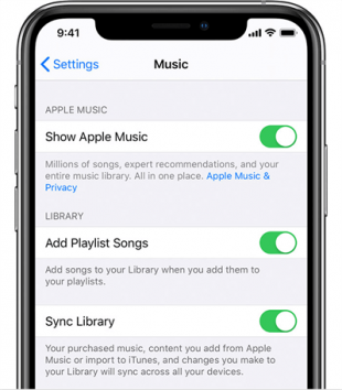 Generally, Sync Library is turned on by default. If you turned off Sync Library, you can turn it back on: Go to Settings > Music > Turn on Sync Library. (You will not see an option to turn on the Sync Library if you don’t subscribe to Apple Music.)