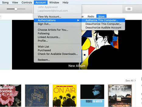 Step 2. Go to the Account > Authorizations and choose to Authorize This Computer in order to get the computer permitted to access and use your Apple ID.