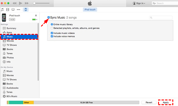 Step 2: Tap the Music option, and next select Sync Music (Entire music library or Selected playlist, artists, albums, and genres of your choice.) Then tap Apply to transfer music from iPod to computer.