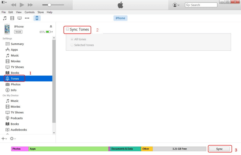 Step 4. Check the Sync Tones option and choose All Tones or Selected Tones option as you like. Now tap the Sync button to share ringtones from iPhone to iPhone.