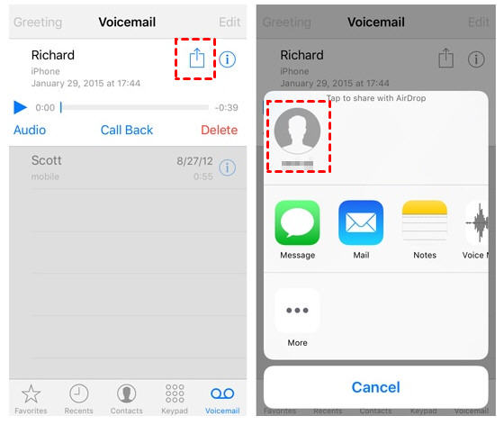 2. Transfer voicemail via AirDrop: go to Phone app on old iPhone > tap Voicemail and select the one you want to transfer > tap the Share button and choose AirDrop > select the contact to confirm.